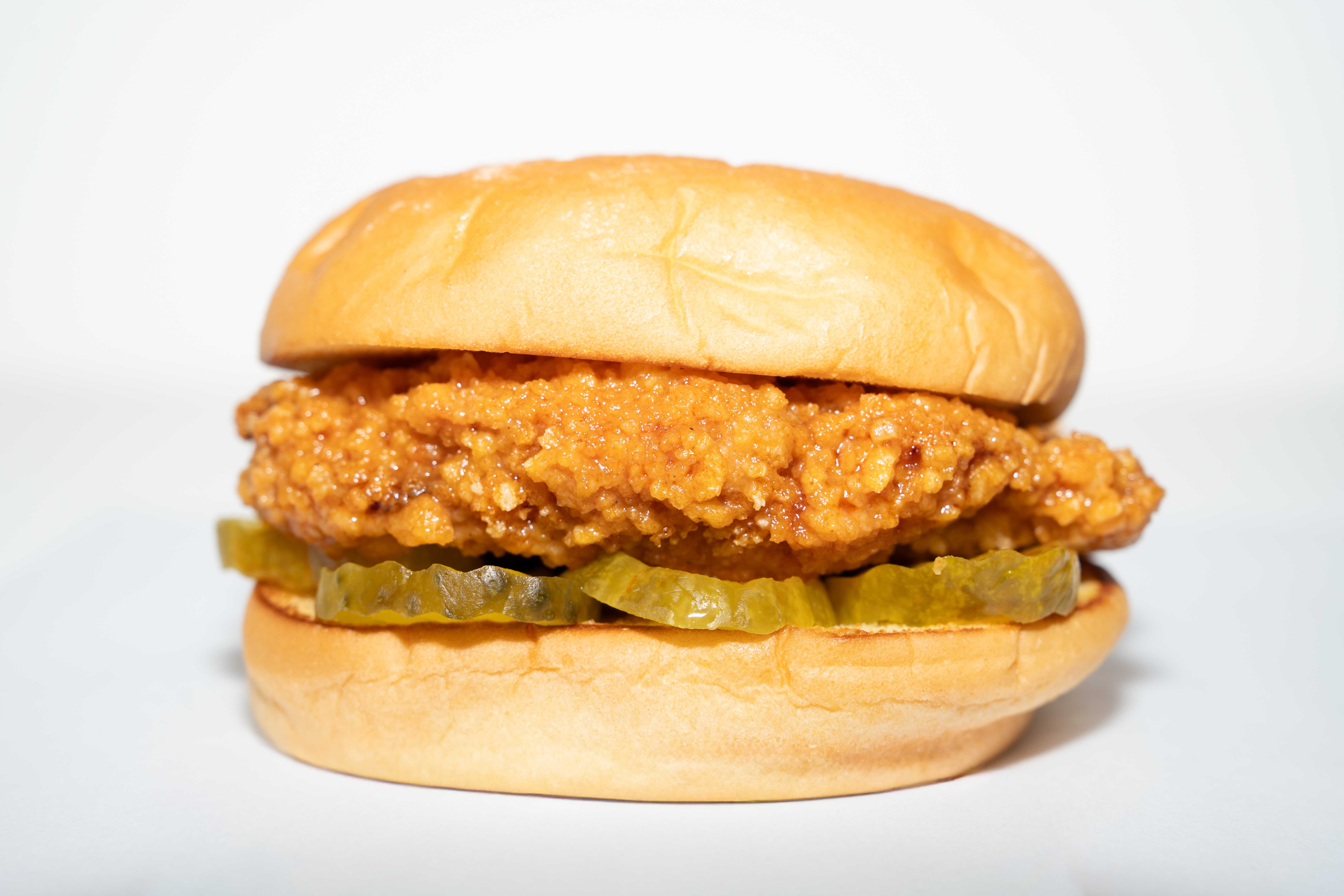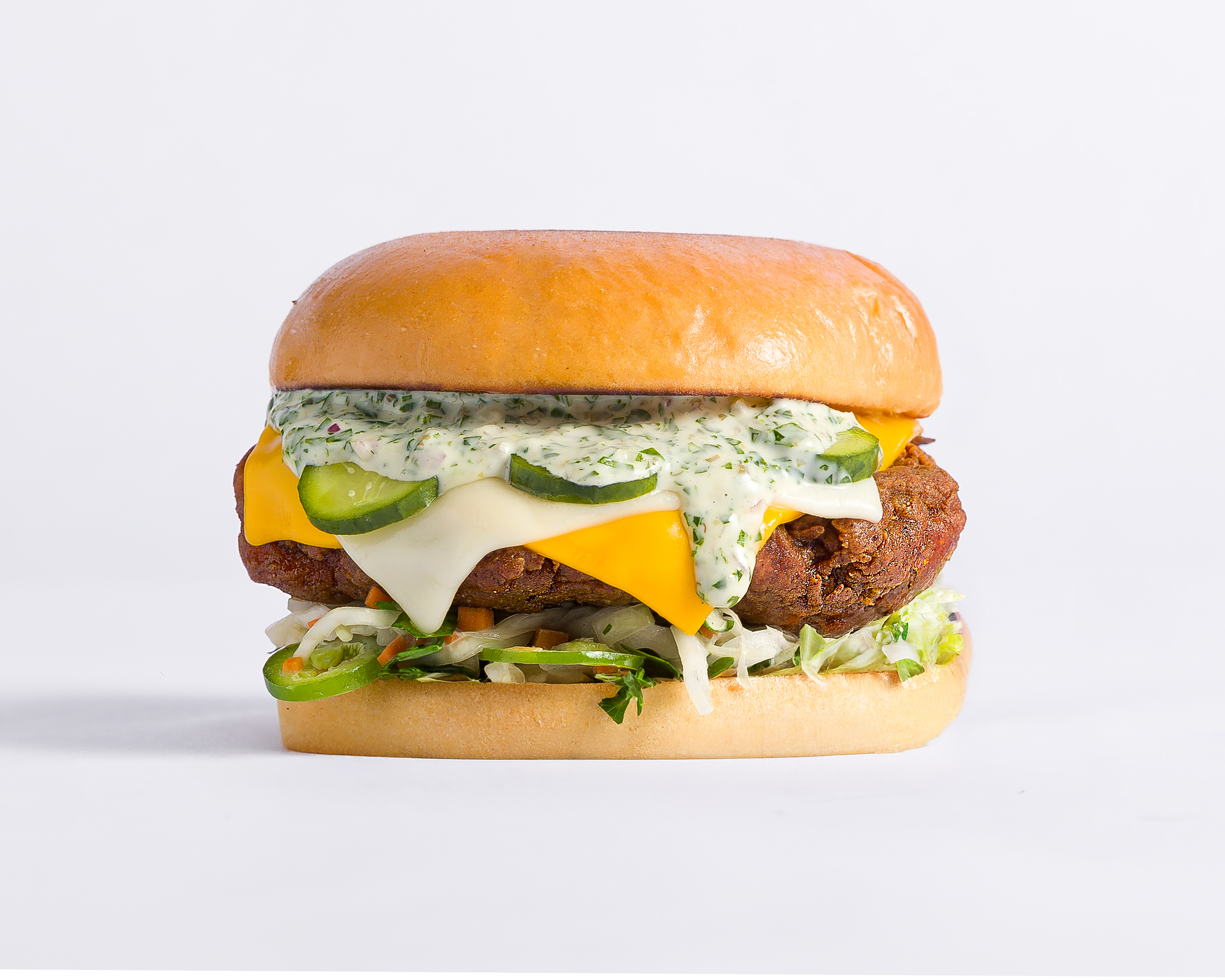 Hamburguesa con 120g de pollo frito, queso cheddar, queso suizo, ensalada de col, salsa tártara, pepinillos