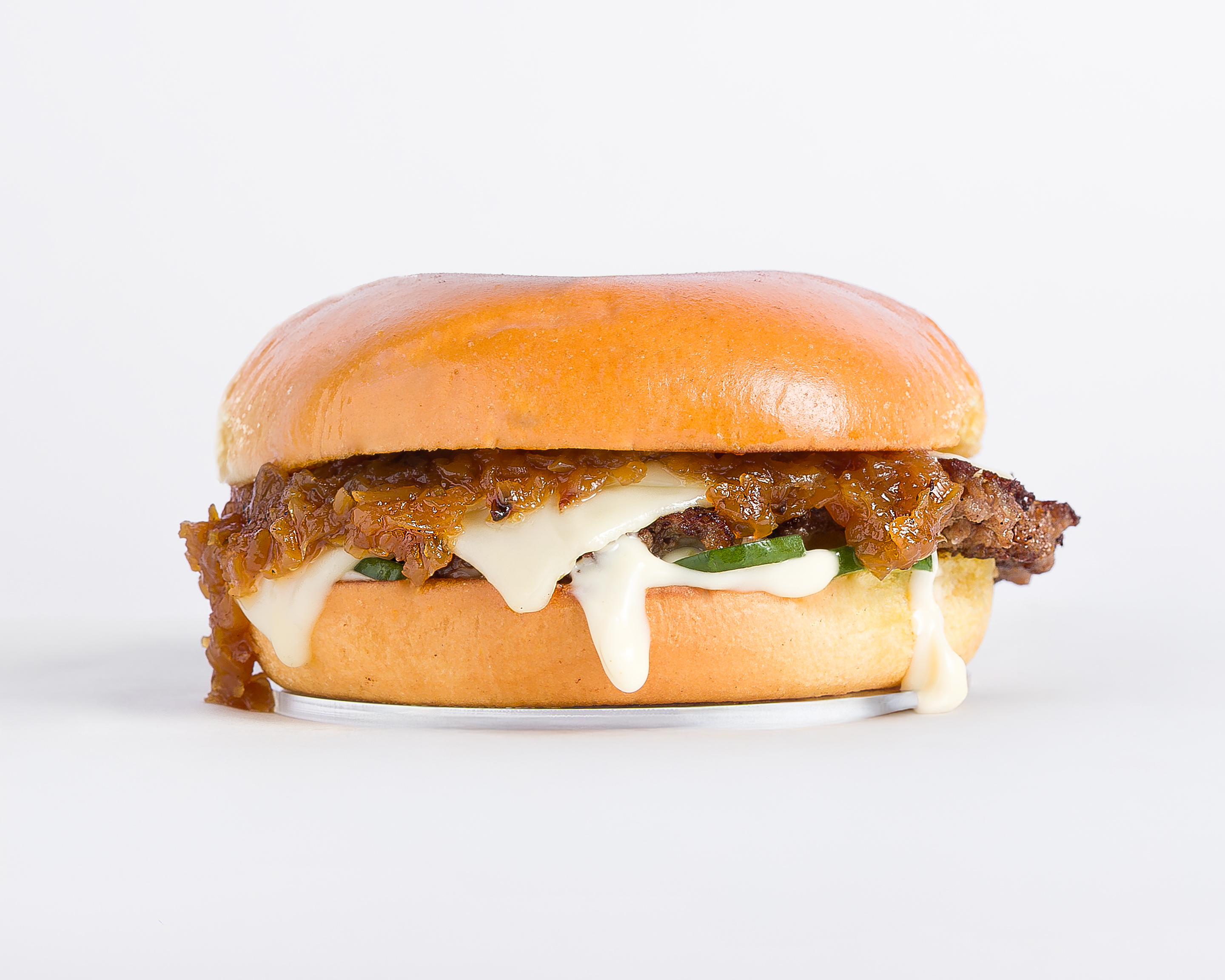 Carne de res prime de 120 g, queso suizo derretido, nuestra cebolla crunchy de la casa, chiles de la casa asados y salsa de trufa