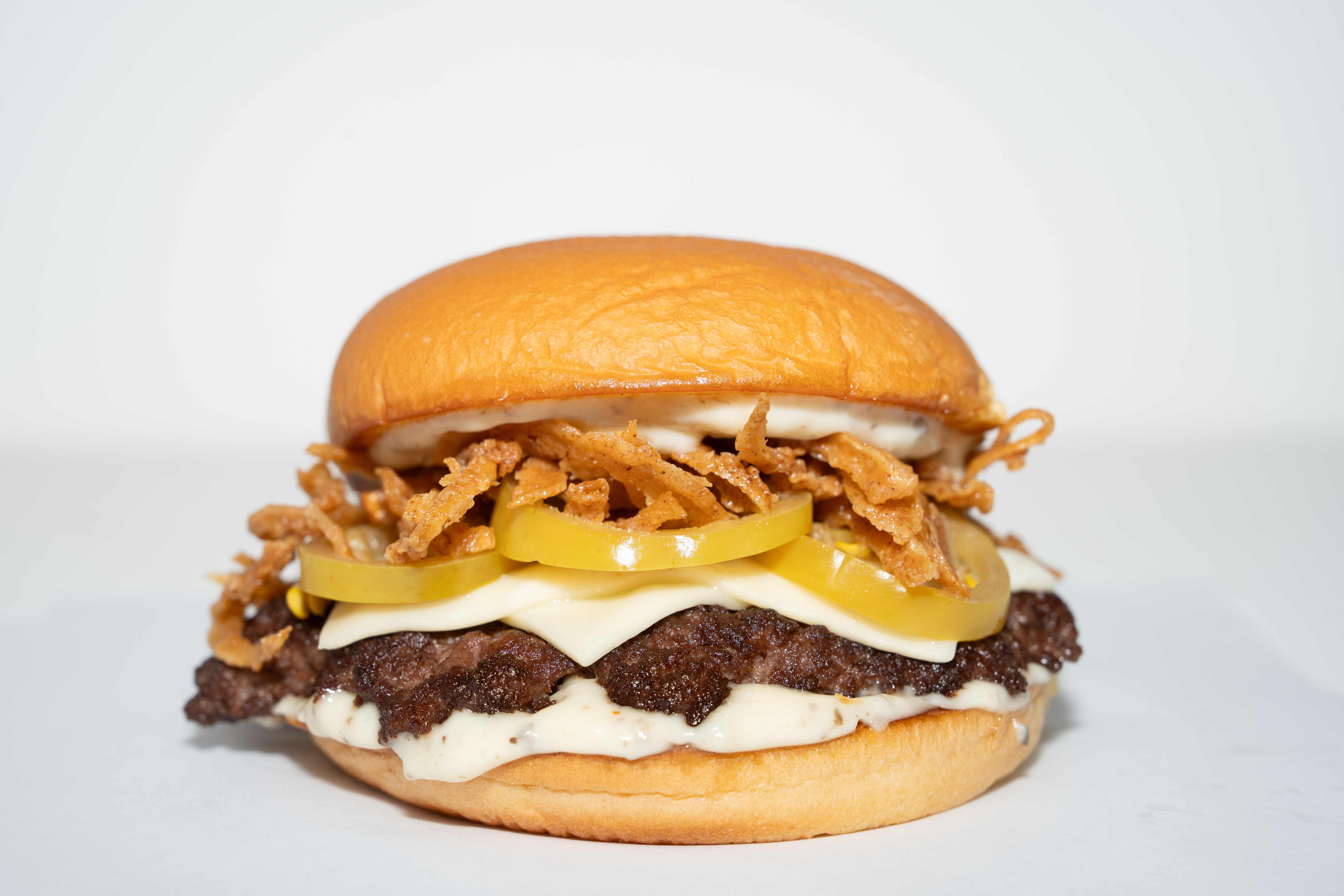 Carne de res prime de 120 g, queso suizo derretido, nuestra cebolla crunchy de la casa, chiles de la casa asados y salsa de trufa